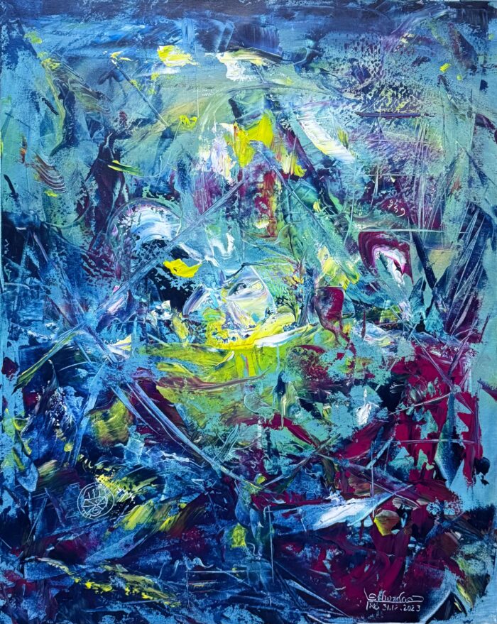 Lucrarea invită privitorul să plonjeze în invizibil — să navigheze printr-un peisaj oniric construit din energie, textură și ritm interior. Tușele alternează între ample și abrupte, suprapuse cu intervenții de cuțit de paletă care evocă hărți sau mesaje codificate ascunse în psihic.